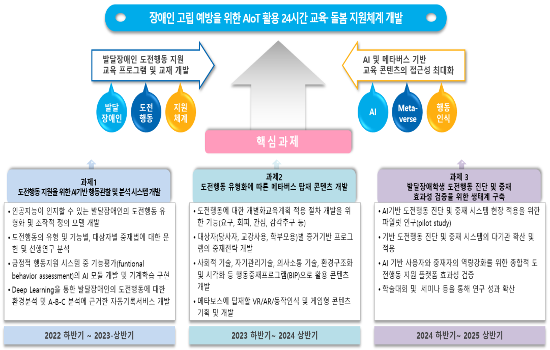 발달장애인의 개별적인 요구와 특성, 교육 및 사회 환경의 변화 등과 같은 요소를 종합적으로 고려하여 "장애인 고립 예방을 위해 AIoT를 활용한 지속 가능한 24시간 교육 및 돌봄 지원체계 개발"하고자 함.