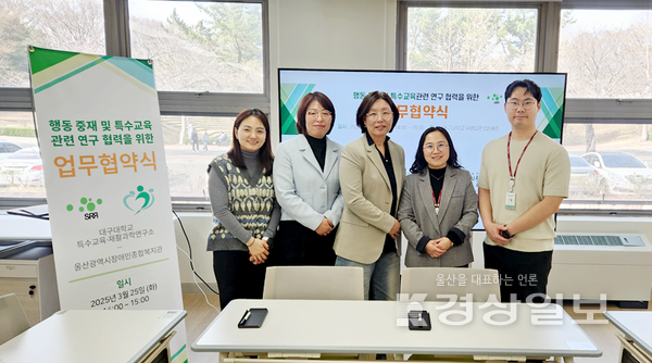 울산광역시장애인종합복지관(관장 이득규)과 대구대학교 특수교육재활과학연구소(소장 박경옥)는 25일 발달장애인을 위한 행동중재 및 특수교육 관련 연구 협력을 목적으로 업무협약(MOU)을 체결했다.